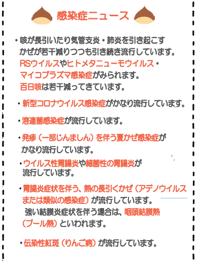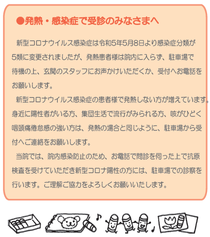現在新型コロナウイルス感染症が流行しています。熱が出ない方もいるようですが、集団生活で流行している場合は事前にお知らせの上、発熱の場合と同じようにお車で待機をお願いします。また、咳が続く風邪の流行は依然続いています。薬を飲み終わっても症状が続く場合は受診してください。